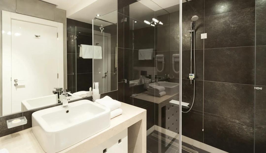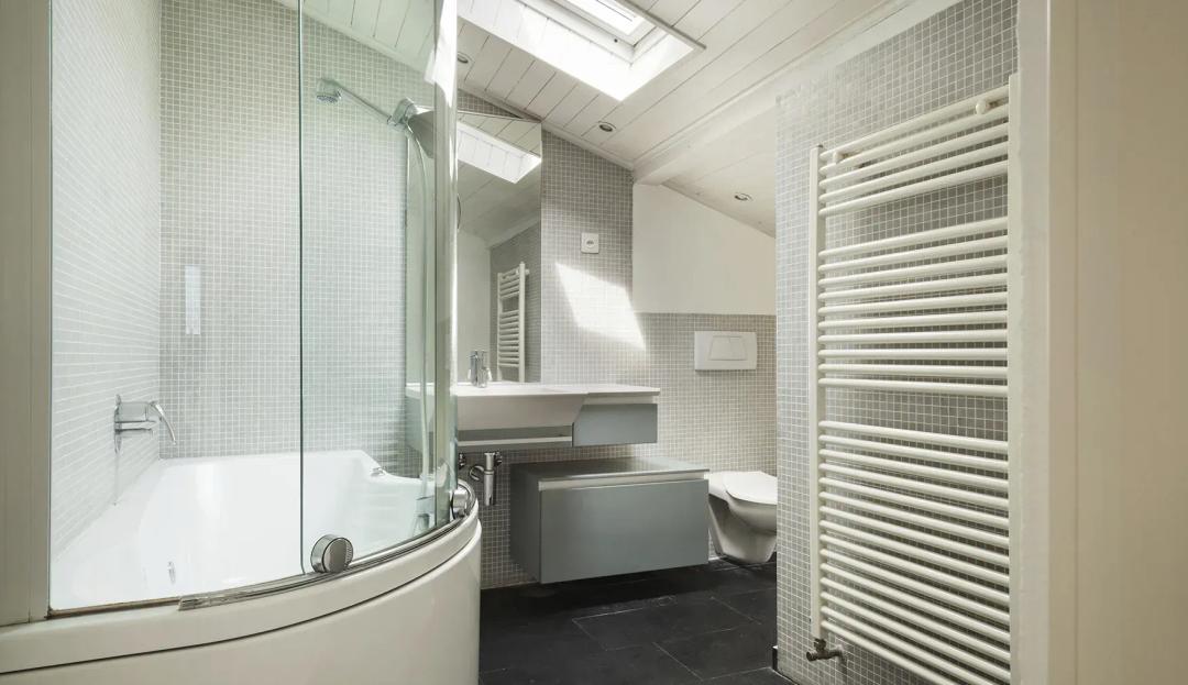 In die Nische eingebaute Dusche mit Glasschiebetür und Fliesenspiegel aus Mosaikfliesen. Freistehende Badewanne und hochwertige Badmöbel mit Einsatzwaschbecken.
