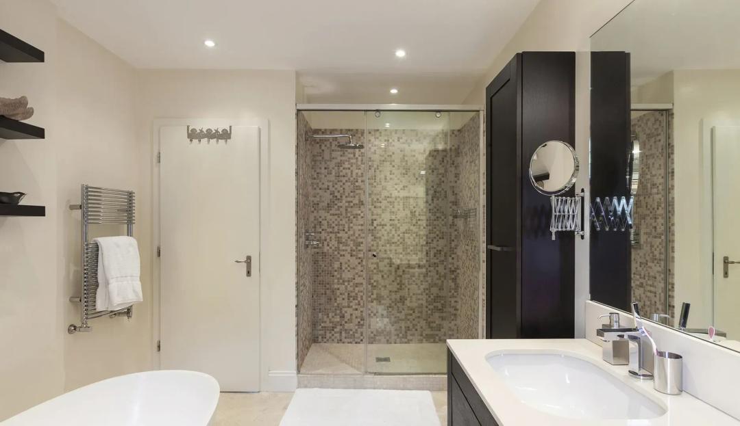 Ebenerdige verglaste Dusche, freistehende Badewanne, doppelter Marmor Waschtisch und Marmorboden. Separatem Toilettenraum.